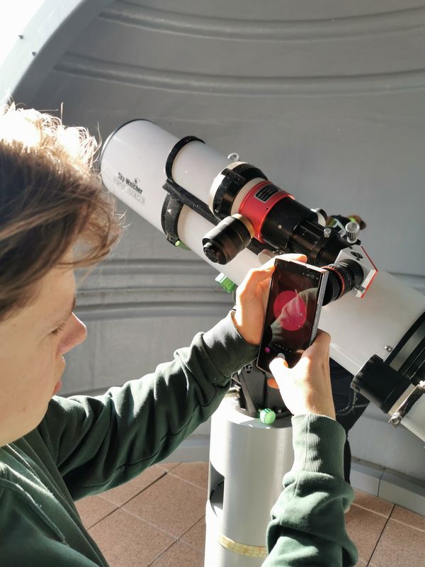 Během návštěvy jsme plně využili naše technické vybavení a zaměřili dalekohledy přímo na naši nejbližší hvězdu – Slunce. Společně jsme pozorovali fascinující děje ve sluneční atmosféře a zkoumali detaily, které za běžných okolností nejsou pouhým okem viditelné. Je pro nás vždy velkou radostí sledovat, že mladá generace jeví o vesmír a přírodní vědy upřímný zájem.